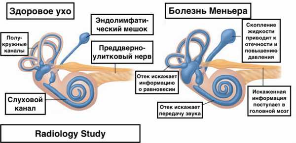 При болезни Меньера клинические проявления обусловлены гидропсом во внутренном ухе. Растяжение мембраны преддверия и изменение объёма жидкости в эндолимфатическом пространстве способствуют искажению информации о равновесии и передачи звука.