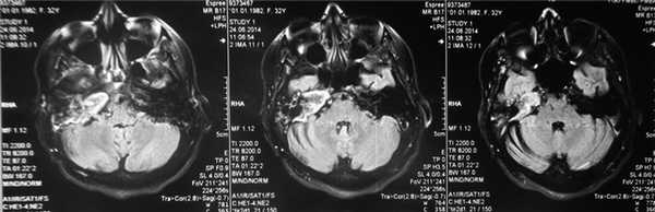 ![МРТ головы. Гиперинтенсивный сигнал в области сосцевидной пещеры, сосцевидного отростка и пирамиды правой височной кости (холестеатома)]()