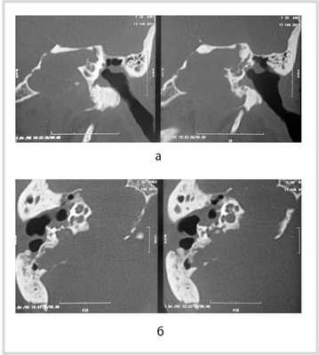 Рис. 1. КТ височных костей пациентки М. а — коронарная проекция: деструктивная полость в пирамиде височной кости, заполненная субстратом неоднородной плотности, капсула лабиринта значительно разрушена на уровне базального и апикального завитков улитки, латерального и верхнего полукружных каналов; б — аксиальная проекция: деструктивная полость с разрушением задней грани пирамиды, передневерхней и нижней поверхности.