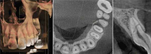 Рис. 5. КЛКТ, косо-сагиттальная и корональная томограммы дистального корня 4.7 зуба.