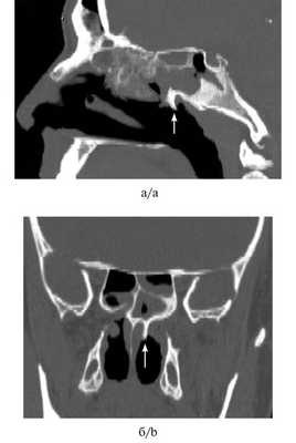 Послеоперационный период протекал без особенностей, носовые кровотечения не рецидивировали. Больной был выписан на 5-е сутки в удовлетворительном состоянии без каких-либо жалоб. Результаты контрольной КТ показали, что образование в носоглотке тотально удалено, в своде носоглотки сохранился небольшой фрагмент ножки полипа, в которой дифференцировался небольшой остаточный костный шип (рис. 5 а, Рис. 5. КТ околоносовых пазух пациента Л. после операции. а, б — реконструкция в сагиттальной плоскости. Образование носоглотки удалено, в своде носоглотки визуализируется фрагмент ножки полипа, в котором виден небольшой костный шип (стрелки). б).