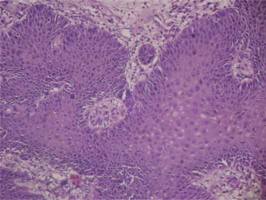 Рис. 1. Гистологическая картина гигантского полипа с эпидермизацией, метаплазией эпителия. Рис. 2. Гистологическая картина гигантского полипа с метаплазией эпителия и фиброзированием стромы.