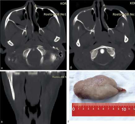 Рис. 1. СК-томограмма околоносовых пазух больной К. а, б — аксиальная проекция: определяется АХП, исходящий из правой верхнечелюстной пазухи и занимающий всю носоглотку; в — коронарная проекция: полип спускается в гортаноглотку до уровня края надгортанника; г — удаленный полип.