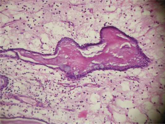 Нами проанализированы результаты гистологического исследования: при светооптическом исследовании строение удаленных фрагментов соответствует железисто-кистозным полипам с выраженными признаками воспаления преимущественно пролиферативной фазы. Строма отечна, с обилием полнокровных капилляров, отмечаются скопления желез с гиперсекрецией слизи, многие из которых кистозно расширены. Эпителий, выстилающий заполненные слизью кистозно измененные железы, однорядный, уплощенный, атрофичный. Вокруг желез и сосудов отмечается выраженная инфильтрация лимфоцитами, плазматическими клетками, эозинофилами, полинуклеарами. Регистрируются обширные участки фиброзирования стромы с деформацией железистых элементов и уменьшением клеточных элементов. Покровный эпителий на большем протяжении сохраняет гистотипическую форму многорядного мерцательного эпителия респираторного типа со значительным количеством бокаловидных клеток. Однако отмечаются участки замещения респираторного эпителия на многослойный плоский переходного типа с фокусами эпидермоидной метаплазии, что сопровождается утолщением покровного эпителия, появлением шиповидных клеток, акантозом и кератозом (рис. 1).