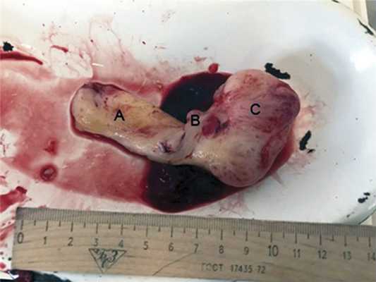 Пациенту в связи с невозможностью выполнения эндоскопического оперативного лечения за счет гигантских размеров новообразования было выполнено его удаление через рот при помощи окончатых щипцов Юраша для носоглотки под местной поверхностной анестезией 10% лидокаином (рис. 2). Рис. 2. Макроскопическое оперативное изображение удаленного полипа. Полип серо-желтого цвета, плотноэластической консистенции, длиной 14 см (в расправленном состоянии), шириной от 3 до 7 см, толщиной 3 см. А — часть полипа, обтурирующего клиновидную пазуху; В — ножка полипа; С — часть полипа, расположенная в носоглотке. По данным макроскопического исследования: новообразование плотноэластической консистенции, по внешнему виду напоминает полипозную ткань.