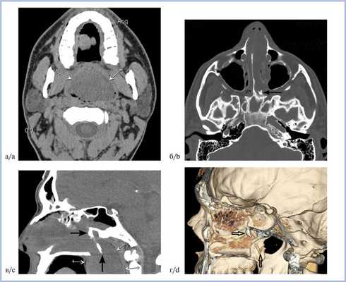 Пациентке была проведена спиральная компьютерная томография (СКТ) околоносовых пазух, которая позволила обнаружить АХП, исходящий из правой верхнечелюстной пазухи, спускающийся в гортаноглотку почти до уровня верхнего края надгортанника (рис. 1, а—в).