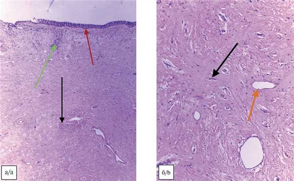 Результаты гистологического исследования представлены на рис. 4. Рис. 4. Гистологическое исследование удаленного материала. Определяется выраженный фиброз стромы полипа (черная стрелка), большое количество сосудов разного калибра (оранжевая стрелка), в отдельных сосудах склероз стенки, поверхность полипа частично выстлана мерцательным эпителием (красная стрелка). В субэпителиальных отделах имеет место отек, очаговая полиморфно-клеточная воспалительная инфильтрация (зеленая стрелка). Окраска гематоксилином и эозином. Ув. 10 (а); ув. 20 (б).