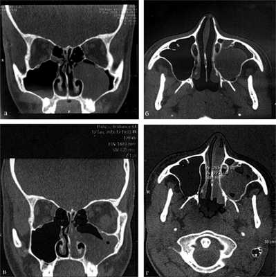 Рис. 2. СК-томограмма больного Ф. а, б — СКТ от 09.09.2015: определяется киста левой верхнечелюстной пазухи, полость носа свободна; в, г — СКТ от 12.01.2016: имеется киста и АХП.