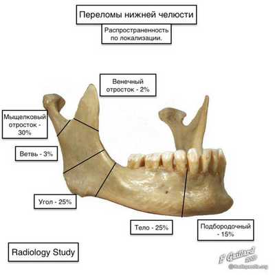 Переломы нижней челюсти могут происходить в области зубов или кзади от них. По существу, нижняя челюсть является «костным кольцом», для которого характерны множественные, часто двусторонние переломы. При этом необходимо определить локализацию перелома, идентифицировать степень/ направление смещения костных отломков и оценить наличие подвывиха или вывиха мыщелков. Кроме того, следует определить наличие повреждения нижнечелюстного канала и зубов.