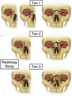При НОЭ переломах возможен разрыв медиальной связки века и повреждение слезного аппарата. Необходимо идентифицировать раздробление и смещение костных отломков кзади в решетчатую кость или вверх в переднюю черепную ямку.