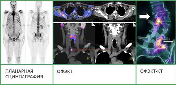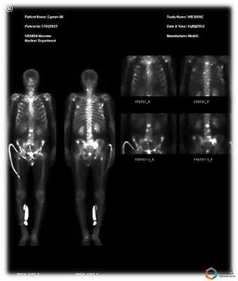 - ОФЭКТ-КТ - наиболее информативная методика. Во время исследования данные сцинтиграфии совмещают со снимками, полученными с помощью КТ. Это позволяет получать трехмерные изображения, судить не только о патологических изменениях в костях, но и о точной локализации очагов.