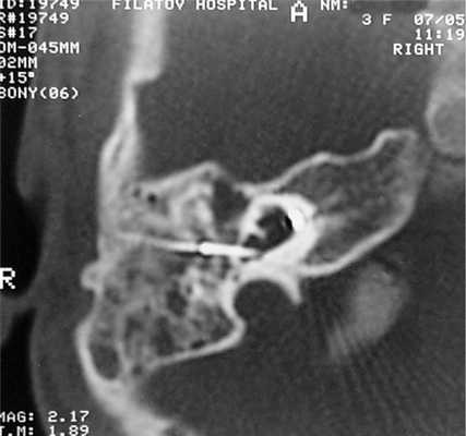 Рис. 3. КТ, аксиальная проекция. Аномалия Мондини, состояние после КИ.
