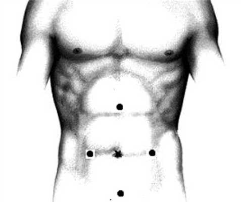 Методология лапароскопической ревизии брюшной полости при травматических повреждениях на данный момент детально не разработана и требует совершенствования. Основная трудность этого этапа операции заключается в невозможности определить локализацию зоны операции до окончания ревизии. В связи с этим возникает неопределенность с первоначальной расстановкой троакаров и последовательностью ревизии. Наш опыт показывает, что оптимальным расположением троакаров при неопределенной локализации повреждений является расстановка четырех 10-миллиметровых троакаров в виде ромба: в эпигастральной и надлобковой областях, справа и слева в мезогастрии (рис. 1). Такая расстановка портов, по нашему мнению, обеспечивает адекватный доступ к любой области брюшной полости.