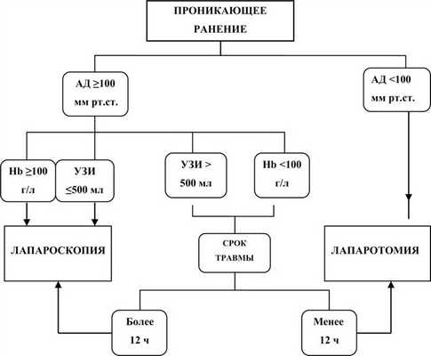 Однако в настоящее время отсутствует единый подход в определении показаний и противопоказаний к лапароскопии при диагностике и лечении проникающих ранений живота, а травматологические центры во всем мире разрабатывают собственные алгоритмы [10, 20]. Так, ряд авторов предлагают использовать этот диагностический метод для определения характера ранения (проникающее или непроникающее в брюшную полость) [13]. Другие авторы показаниями к выполнению лапароскопии считают подозрение на ранение внутренних органов, диафрагмы, неоднозначные находки рентгенологического исследования, а также увеличение количества свободной жидкости в брюшной полости [10]. Основным противопоказанием к использованию лапароскопии, по данным как российских, так и зарубежных источников литературы, является нестабильность гемодинамики пациента [10, 13, 20]. Согласно мнению некоторых авторов, к противопоказаниям также относят напряжение передней брюшной стенки, повреждения задней стенки живота, беременность, наличие лапаротомий в анамнезе, хронические сердечно-сосудистые и респираторные заболевания, сопутствующую тяжелую черепно-мозговую травму, недостаточную квалификацию хирургов для безопасного выполнения исследования [13].