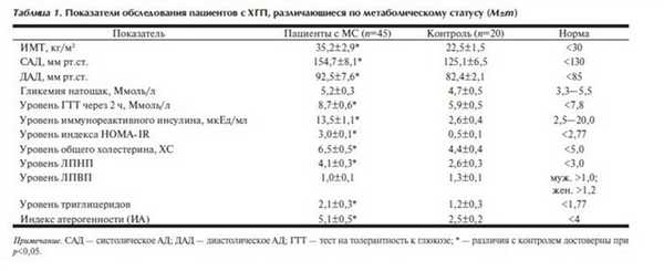 У всех пациентов оценивали общее состояние здоровья. Анализировали параметры антропометрического исследования с расчетом индекса массы тела (ИМТ), артериального давления (АД), биохимические показатели углеводного и липидного обмена в венозной крови (уровни триглицеридов, общего холестерина (ХС), липопротеидов низкой плотности (ЛПНП), липопротеидов высокой плотности (ЛПВП), уровни глюкозы и инсулина натощак, данные теста на толерантность к глюкозе, индекс инсулинорезистентности (HOMA-IR). Для постановки диагноза МС использовали критерии Всероссийского научного общества кардиологов (2009).
