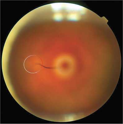Рис. 3. Офтальмоскопическая картина: S-образный ход Клокетова канала и его Y-образное прикрепление к диску зрительного нерва.