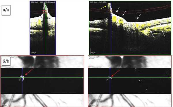 На поперечных срезах изображения перипапиллярной области, полученных методом ОКТА (SPECTRALIS HRA+OCT с модулем ОКТ-ангиографии, Heidelberg Engineering, Германия), отчетливо визуализировался кровоток от ретинальных и хориоидальных сосудов, а также отмечен сигнал средней рефлективности от тяжа (КК) соответственно локализации ПГА в заднем отделе стекловидного тела (рис. 4, а). Можно было бы предположить, что имеет место артефакт изображения, но присутствие кровотока подтверждалось наличием гиперрефлективного локуса в той же проекции на en-face снимках (рис. 4, б). В области сосочка Бергмейстера активный кровоток не определялся. Кроме того, проведение исследования позволило выявить наличие задней тракционной отслойки СТ и элевацию ретинального контура в зоне сосочка Бергмейстера.