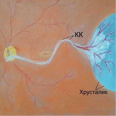 При ультразвуковом сканировании (Voluson E8 GE, США) в B-режиме с исследованием полости стекловидного тела в различных пространственных плоскостях определялся достаточно тонкий гиперэхогенный тяж (КК) неравномерной толщины (до 1,5 мм). Отмечено, что тяж имеет плавный изгиб и берет начало от заднего полюса в проекции ДЗН, после чего, распространяясь кпереди, прикрепляется к ЗКХ с назальной стороны. В режиме цветного допплеровского картирования явных акустических признаков потоков крови в КК не было.