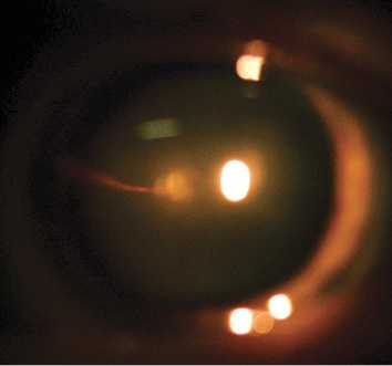 Рис. 1. Биомикроскопическая картина в области прикрепления Клокетова канала к задней капсуле хрусталика.