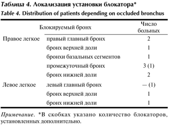 Перед процедурой обязательно выполняли фибробронхоскопию для оценки состояния трахеобронхиального дерева и выбора блокатора нужного размера. Далее выполняли стандартную процедуру окклюзии бронха.