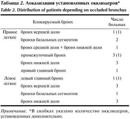 Все пациенты госпитализированы в стационар с установленным диагнозом. Установку клапана в бронх производили на 2—3-е сутки после поступления в стационар. В 3 случаях через 1—2 сут после первичной проведена дополнительная процедура из-за сохраняющегося сброса воздуха. Данные по локализации установленных блокаторов в группе 1 представлены в табл. 2.