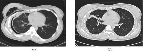 Рис. 5. Мультиспиральные компьютерные томограммы органов грудной клетки через 1 мес после установки бронхоблокатора и выполненного оперативного вмешательства (a и б): ателектаз легочной ткани; остаточная плевральная полость не определяется, торакостома ликвидирована.