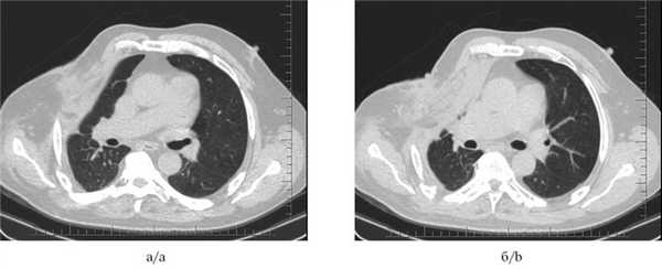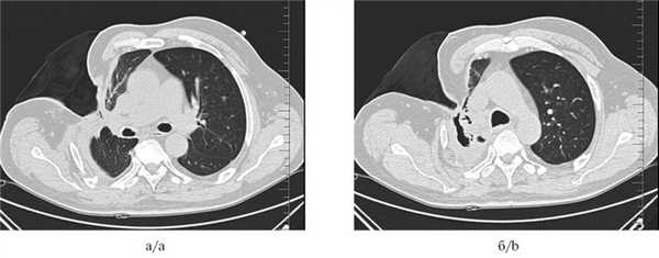 Рис. 3. Мультиспиральные компьютерные томограммы органов грудной клетки до (а) и после (б) установки бронхоблокатора.