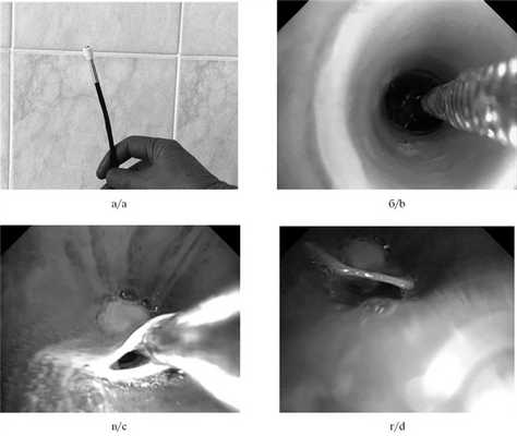 Рис. 1. Этапы установки окклюдера бронха: а — клапанный бронхоблокатор перед установкой в бронх, б — проведение бронхоблокатора, в — извлечение биопсийных щипцов, г — установленный бронохоблокатор (эндофотографии).