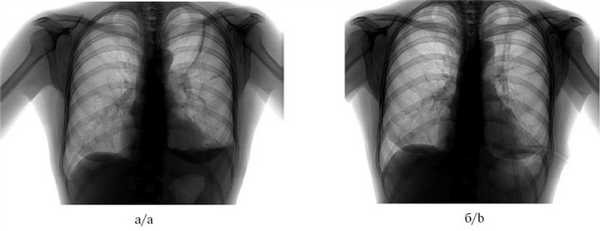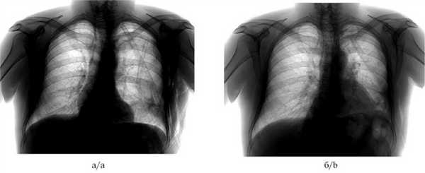 Рис. 6. Рентгенограмма органов грудной клетки пациента со спонтанным пневмотораксом до (а) и после (б) выполнения окклюзии бронха.