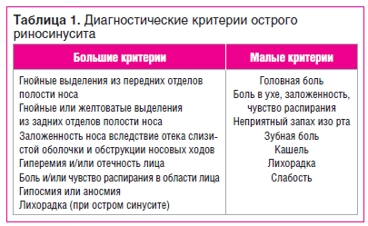 Пациенты предъявляют жалобы на назальные симптомы: заложенность носа, ринорею, чихание, которые преобладают на второй-третий день и уменьшаются к пятому дню заболевания. Важно отметить, что симптомы ринита снижают качество жизни пациентов: отмечаются расстройства сна, снижение работоспособности и успеваемости в школе, психологические нарушения. Практически при любой ОРВИ в процесс вовлекаются околоносовые пазухи (ОНП). В таблице 1 приведены диагностические критерии острого риносинусита (ОРС). Диагноз устанавливается при наличии по крайней мере 2 больших или 1 малого или более 2 малых критериев. Иногда к ОРС присоединяется вторичная бактериальная инфекция. Некоторые заболевания, включая попадание инородного тела в носовые ходы или прободение перегородки носа, перелом носа, предрасполагают к длительному течению инфекционного ринита.