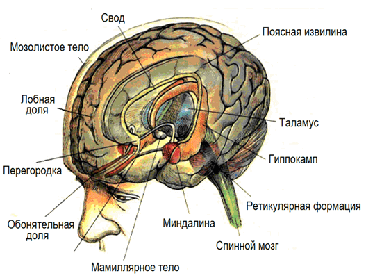 Лимбическая система - морфофункциональное объединение, которое включает в себя образования древней коры, формирующих обонятельный мозг и состоящий из обонятельных луковиц, обонятельного бугорка, прозрачной перегородки и прилегающих областей коры (препериформная, периамигдалярная и диагональная области). Следующий компонент лимбической системы - старая кора, объединяющая гиппокапм, зубчатую фасцию, основание гиппокампа и расположенную над мозолистым телом поясную извилину. Из подкорковых структур в лимбическую систему входят миндалевидный комплекс и ядра мозговой перегородки. К лимбической системе причисляют также переднее таламическое ядро, мамиллярные тела и гипоталамус.