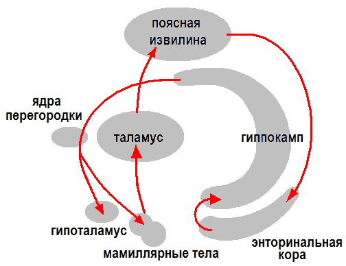 В так называемый «круг Пейпеса» входят: гиппокамп - мамиллярные тела - передние ядра таламуса - кора поясной извилины - парагиппокампальная извилина - гиппокамп. Этот круг отвечает за эмоции, формирование памяти и обучения.