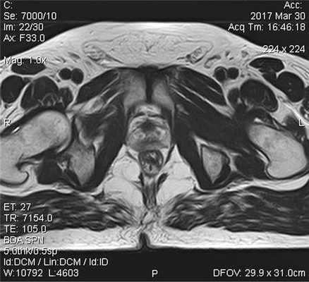 Пациент К., 1965 года рождения, при плановом обследовании в поликлинике по месту жительства в марте 2017 г. выявлено повышение уровня ПСА до 6,5 нг/мл, в связи с чем в ГКБ № 29 Москвы выполнена трансректальная биопсия предстательной железы, гистологически верифицирована ацинарная аденокарцинома 6 (3+3) баллов по Глисону. Больной самостоятельно обратился в МНИОИ им. П.А. Герцена. При пересмотре стекол препаратов биопсии предстательной железы в условиях патоморфологического отделения МНИОИ им. П.А. Герцена на фоне гиперплазии предстательной железы с очагами атрофии в 5 фрагментах из 12 выявлен рост ацинарной аденокарциномы 7 (4+3) баллов по Глисону, занимающей до 100% площади столбиков. По данным УЗИ и МРТ малого таза, предстательная железа размером 42×34×30 мм, объемом до 30 см 3 (рис. 3). Рис. 3. Магнитно-резонансная томограмма малого таза.
