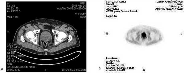 Пациент С., 1945 года рождения, считает себя больным с 2012 г., когда впервые отметил затруднения при мочеиспускании, однако к врачам не обращался. В июле 2016 г. при плановом обследовании по месту жительства выявлено повышение ПСА до 276 нг/мл, выполнена трансректальная биопсия предстательной железы под ультразвуковым контролем. Больной для дальнейшего обследования и лечения обратился в поликлинику МНИОИ им. П.А. Герцена. При гистологическом исследовании, пересмотре стекол и блоков гистологических препаратов в МНИОИ им. П.А. Герцена выявлен инфильтративный рост ацинарной аденокарциномы 7 (4+3) баллов по Глисону, занимающей до 80% площади биоптатов. Пациент самостоятельно выполнил ПЭТ/КТ с холином. По данным ПЭТ/КТ, в обеих долях простаты определяются очаги накопления радиофармпрепарата (РФП) неоднородного характера, с наиболее выраженным накоплением РФП до макс. SUV 12,09 в периферической зоне слева и переходных зонах предстательной железы с обеих сторон (рис. 1), Рис. 1. Компьютерная томограмма малого таза (а). Накопление РФП в предстательной железе (б). в семенных пузырьках слева и справа, а также в наружном подвздошном лимфатическом узле слева макс. SUV 4,47, размером 1,3×0,7 см.