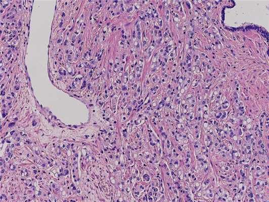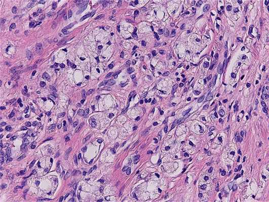По данным трансректального УЗИ, предстательная железа значительно увеличена: размер 68×62×67 мм, объем 143 см 3 . Большую часть железы занимают сливающиеся между собой узлы аденомы до 60×55×52 мм. Узлы гетерогенной структуры от гипер- до гипоэхогенной. В периферических областях больше справа выявляются гипоэхогенные очаги неправильной формы (при эластографии ригидные) от 12×8 до 17×6 и 24×13 мм. Один из очагов вовлекает правый семенной пузырек. При пальцевом ректальном исследовании предстательная железа значительно увеличена в размере, деформирована за счет левой доли, консистенция которой изменена до каменистой плотности, поверхность железы бугристая, междолевая бороздка сглажена. Слизистая оболочка прямой кишки над железой подвижна. Другой очаговой опухолевой патологии не выявлено. На основании комплексного обследования установлен клинический диагноз: РПЖ IV стадии сТ3bN1M0. Сопутствующая патология: артериальная гипертензия II стадии, 3-й степени. На консилиуме с участием хирурга, химиотерапевта, лучевого терапевта и онколога, учитывая размер, локализацию и распространенность опухолевого процесса, отсутствие отдаленных метастазов, больному рекомендовано хирургическое лечение. 07.09.16 выполнена радикальная простатэктомия с расширенной тазовой лимфаденэктомией. Интраоперационно выявлены увеличенные лимфатические узлы: по ходу внутренних подвздошных сосудов справа узел до 1,2×1,5 см, по ходу наружных подвздошных сосудов слева 1,5×1 см. Послеоперационный период протекал гладко, без осложнений. При контрольном УЗИ органов малого таза и вен нижних конечностей от 13.09.16: в малом тазу в левой подвздошной области определяется лимфоцеле с признаками организации объемом 80 см 3 . В правой подвздошной области патологических образований нет. Поверхностные и глубокие вены проходимы на всем протяжении, без признаков тромбоза. Подвздошные и нижняя полая вена проходимы. По данным цистографии от 14.09.16, при тугом заполнении контрастом мочевого пузыря выхода контраста за пределы везикоуретрального анастомоза нет. 14.09.16 уретральный катетер удален, самостоятельное мочеиспускание восстановлено. Проведена антибактериальная, инфузионная, симптоматическая терапия, а также профилактика тромбоэмболических осложнений с положительным эффектом. Послеоперационная рана зажила первичным натяжением. Пациент выписан на 9-е сутки в удовлетворительном состоянии. При плановом гистологическом исследовании операционного материала во всех отделах обеих долей предстательной железы, включая отдельно доставленные края резекции, имеется инфильтративный рост ацинарной аденокарциномы с участками перстневидно-клеточной 9 (4+5) баллов по Глисону, с периневральным и периваскулярным ростом, прорастанием в капсулу долей и окружающую жировую клетчатку, в семенные пузырьки и мочеиспускательный канал, наличием опухолевых эмболов в расширенных сосудистых щелях (рис. 2). Рис. 2. Пациент С. Перстневидно-клеточный рак предстательной железы. Окраска гематоксилином и эозином. ×200.