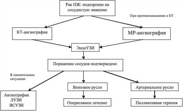 N. Buchs и соавт. [15] предложили алгоритм ведения пациентов с раком ПЖ при подозрении на сосудистую инвазию (рис. 2). Рисунок 2. Алгоритм ведения пациентов с раком ПЖ при подозрении на сосудистую инвазию. ЭндоУЗИ - эндоскопическое ультразвуковое исследование; ЛУЗИ - лапароскопическое ультразвуковое исследование; ВСУЗИ - внутрисосудистое ультразвуковое исследование.