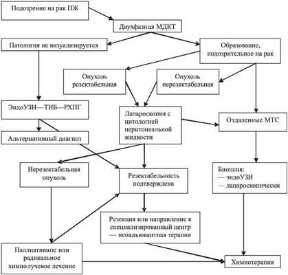 Авторы из Онкологического центра и исследовательского института Г. Ли Моффита (США) предлагают универсальный алгоритм предоперационной оценки состояния больных, включающих МДКТ-исследование со стандартным для ПЖ двухфазным тонкосрезовым протоколом, эндоскопическое ультразвуковое исследование (высокая точность в определении опухолей