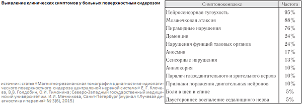 Идиопатический ПС-ЦНС - это [редкое] хроническое медленно прогрессирующее нейродегенеративное заболевание, которое связано с отложением гемосидерина в мягкой мозговой оболочке и на поверхности головного и спинного мозга с вероятностью развития довольно тяжелого неврологического дефицита (наиболее часто участками отложения гемосидерина являются мозжечок, ствол мозга, черепные нервы [II, III, V, X и особенно VIII пары] и спинной мозг). Заболевание значительно чаще развивается у мужчин, чем у женщин,- 3:1. Первые симптомы ПС проявляются в возрасте от 14 до 77 лет. Продолжительность жизни от начала заболевания составляет от 1 года до 38 лет. Чаще всего ПС ЦНС развивается после сорока лет (40 - 62) и приводит к прогрессирующей двусторонней нейросенсорной тугоухости, в основном, с выпадением высокочастотных тонов, мозжечковой дизартрии и атаксии; кроме того, ПС может имитировать различные неврологические и оториноларингологические заболевания. Поэтому врачу-клиницисту следует проводить дифференциальный диагноз [ПС] с аносмией, пирамидными нарушениями, миелопатией, дисфункцией мочевыводящей системы, лобно-височной деменцией, а также с различными параличами черепных нервов (основные клинические симптомы при ПС представлены в таблице [см. далее]. Нарушения трудоспособности и затруднения самообслуживания развиваются примерно через 5 - 15 лет.