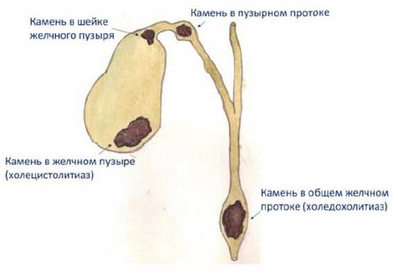 При образовании камней в желчном пузыре (ЖП) говорят о «холецистолитиазе», в общем желчном протоке - о «холедохолитиазе», во внутрипеченочных протоках - о «внутрипеченочном холелитиазе» (рисунок 1).