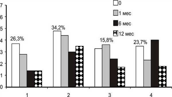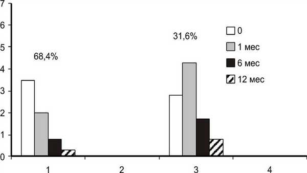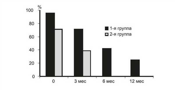 Следует отметить, что, несмотря на одинаковый стаж ЭОП на момент проведения РЙТ, в 1-й группе активность ЭОП сохранялась и через 12 мес, тогда как во 2-й группе уже через 6 мес активных форм ЭОП выявлено не было; они не появились и к 12-му месяцу (р=0,004, p=0,006, p=0,0000, p=0,0002 соответственно) (рис. 2). Рисунок 2. Динамика частоты выявления активных форм ЭОП (CAS >3) в зависимости от эффекта РЙТ.
