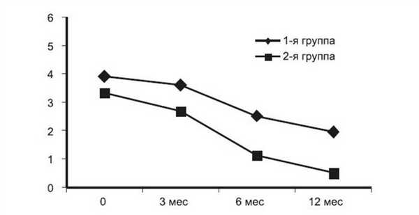 Анализ динамики тяжести ЭОП выявил во 2-й группе значимое увеличение доли легких форм к 12 мес наблюдения (р=0,035) за счет уменьшения доли средних и тяжелых форм (р=0,050). К этому сроку во 2-й группе имело место достоверное снижение среднего интегрального показателя тяжести (p=0,043). В 1-й группе доля легких форм оставалась примерно на одном уровне; доля средних форм за счет снижения тяжелых увеличилась незначительно (p=0,059).