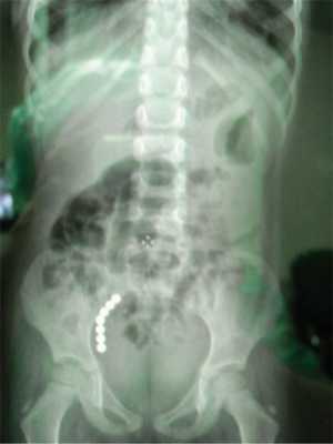 2. Больной Г., 4,5 лет. Поступил 31.08.11 с жалобами на возникший с 30.08.11 оформленный стул «черного» цвета. При осмотре выявлены умеренное напряжение мышц передней брюшной стенки, болезненность при пальпации в эпигастрии. На рентгенограмме брюшной полости визуализированы 28 круглых инородных тел. При дополнительном сборе анамнеза мать вспомнила, что ребенок 26.08.11 проглотил неизвестное количество магнитов от конструктора и жалоб не предъявлял. Выполнена ФЭГДС: умеренная гиперемия слизистой кардиального отдела пищевода, слизистая желудка гиперемированная, с кровоизлияниями, с мелкими изъязвлениями, обнаружена цепочка круглых магнитов, уходящих в пилорический отдел кишечника. Извлечен 21 МИТ, оставшаяся цепочка МИТ плотно фиксирована к задненижней стенке желудка. Предположено взаимное притяжение МИТ со стороны желудка и двенадцатиперстной кишки с перфорацией стенок. Осуществлена конверсия: лапаротомия, брюшина гиперемирована, выпот серозный до 100 мл, гастротомия по большой кривизне, извлечены 8 МИТ. Обнаружены сквозная перфорация задненижней стенки желудка, перфорация брыжейки поперечной ободочной кишки, перфорация тонкой кишки диаметром до 4 мм с уплотненными краями (расстояние от связки Трейца 1 метр). Перфорационные отверстия ушиты двухрядными швами с подведением пряди сальника к стенке желудка. Брюшная полость дренирована. Контрольная рентгенография брюшной полости: МИТ отсутствуют. Послеоперационный период без осложнений, выписан в удовлетворительном состоянии через 12 сут.