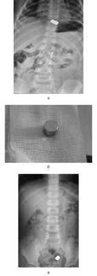 1. Больной Л., 3,5 лет. При поступлении в ЦРБ установлен в анамнезе прием ребенком внутрь нескольких магнитных элементов. На рентгенограмме грудной клетки в нижней трети пищевода прослеживаются сцепленные инородные тела. Попытка их извлечь не имела успеха. Через 6 ч при госпитализации в больницу скорой медицинской помощи № 2 (БСМП № 2) отмечались жалобы на боли в эпигастрии, на рентгенологическом снимке в проекции желудка определялись МИТ (рис. 1, а). Рис. 1. Пациент Л., 3 года 5 мес. При рентгенографии в проекции нижней трети пищевода визуализируются 2 МИТ; б — извлеченный магнит после эзофагоскопии имеет цилиндрическую форму; в — динамика продвижения МИТ (рентгенологический контроль). Во время эзофагоскопии в кардиальном отделе пищевода обнаружено несмещаемое инородное тело в виде металлического цилиндра диаметром 8 мм, сделан вывод, что другой магнит взаимно притягивается со стороны желудка. После нескольких попыток магнит кардиального отдела пищевода захвачен и с усилием извлечен (см. рис. 1, б). На слизистой желудка в области фиксации второго магнита визуализируется выраженная гематома. Для уменьшения времени манипуляции при отсутствии опасности второй одиночный магнит оставлен для самостоятельной эвакуации из ЖКТ. На контрольной рентгенографии брюшной полости подтверждена миграция магнитного объекта по кишечнику (см. рис. 1, в). Магнит вышел самостоятельно.