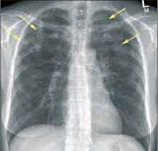 - Рентгенография легких. На снимках видны субплеврально расположенные одиночные (реже множественные, двусторонние) нечеткие затемнения средней интенсивности неправильной формы размером до 3-4 см. В окружении инфильтрата легочный рисунок усилен, тень корня легкого слегка расширена. Характерна быстрая динамика инфильтратов с миграцией по легочным полям и исчезновением не позднее 1-2 недель после обнаружения (чаще через 1-3 дня) без остаточной рубцовой деформации. При длительно поддерживающемся инфильтративном воспалении в ткани легких могут образоваться фиброзные очаги и кистозные полости.