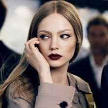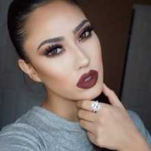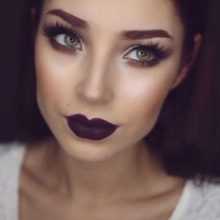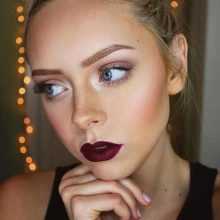 Темные оттенки матовой помады подходят не только брюнеткам и шатенкам. Блондинки с таким ярким макияжем также выглядят эффектно. Темная помада в этом случае хорошо сочетается с тенями, подобранными в тон. Макияж также подходит для вечернего мероприятия.