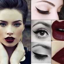 Такой яркий макияж прекрасно подходит брюнеткам с синими или серо-голубыми глазами и бледной кожей. Винная матовая помада прекрасно сочетается с классическими стрелками.