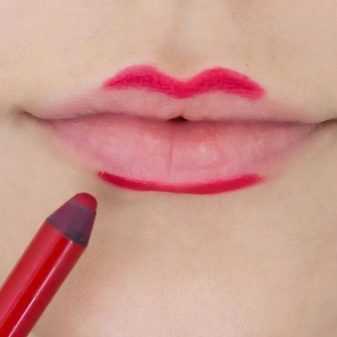 - Процесс создания макияжа начинается так же, как и с использованием помады, но линия прорисовки будет значительно шире.