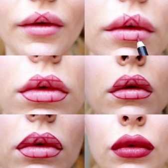 - Обозначение краев губ посредством более толстой прорисовке контура.
