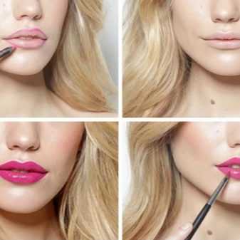 - Помаду набирайте на кисточку. С ее помощью вы заполните морщинки на губах, и помада ляжет лучше. Учитывайте, что матовые помады темных оттенков визуально уменьшают губы, а светлые, наоборот, придают им видимый объем.