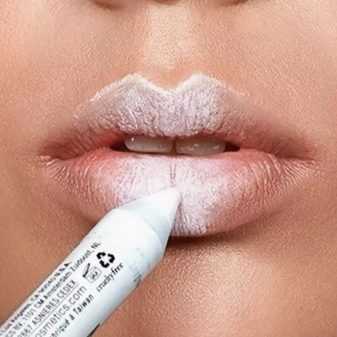 - Для чувственного объема на окрашенных губах по центру наносится белый карандаш, который после использования хорошо растушевывается и снова покрывается той же косметикой.